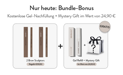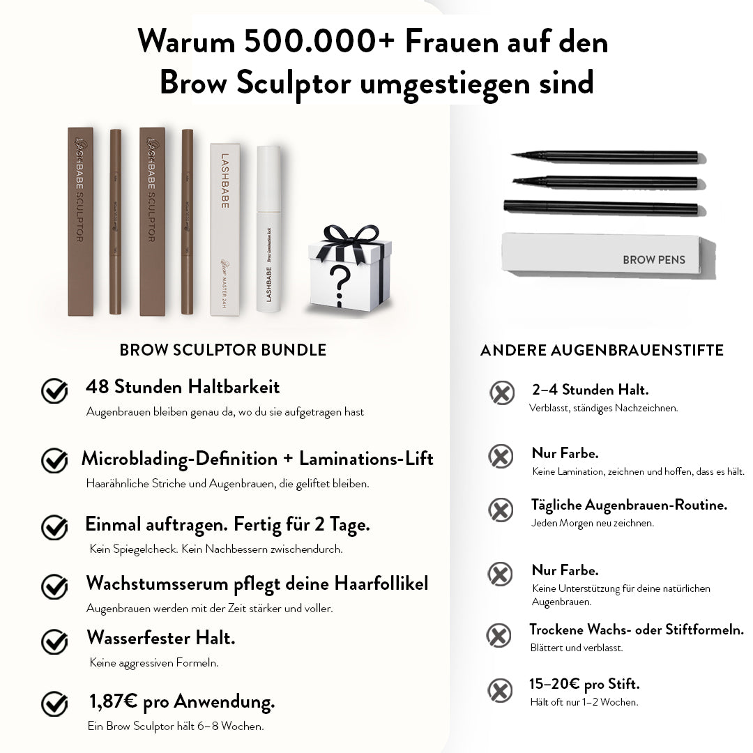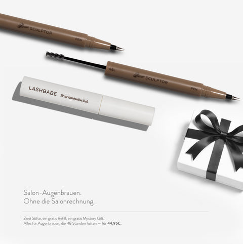 Die zwei Stifte kosten einzeln 59,90€. Das Clear Gel Refill kostet 14,95€ separat. Der Mystery Gift liegt bei 9,95€. Gesamtwert: 84,80€. Du zahlst 44,95€. Du sparst 39,85€, und du hast alles zuhause für salonwürdige Augenbrauen über Monate.