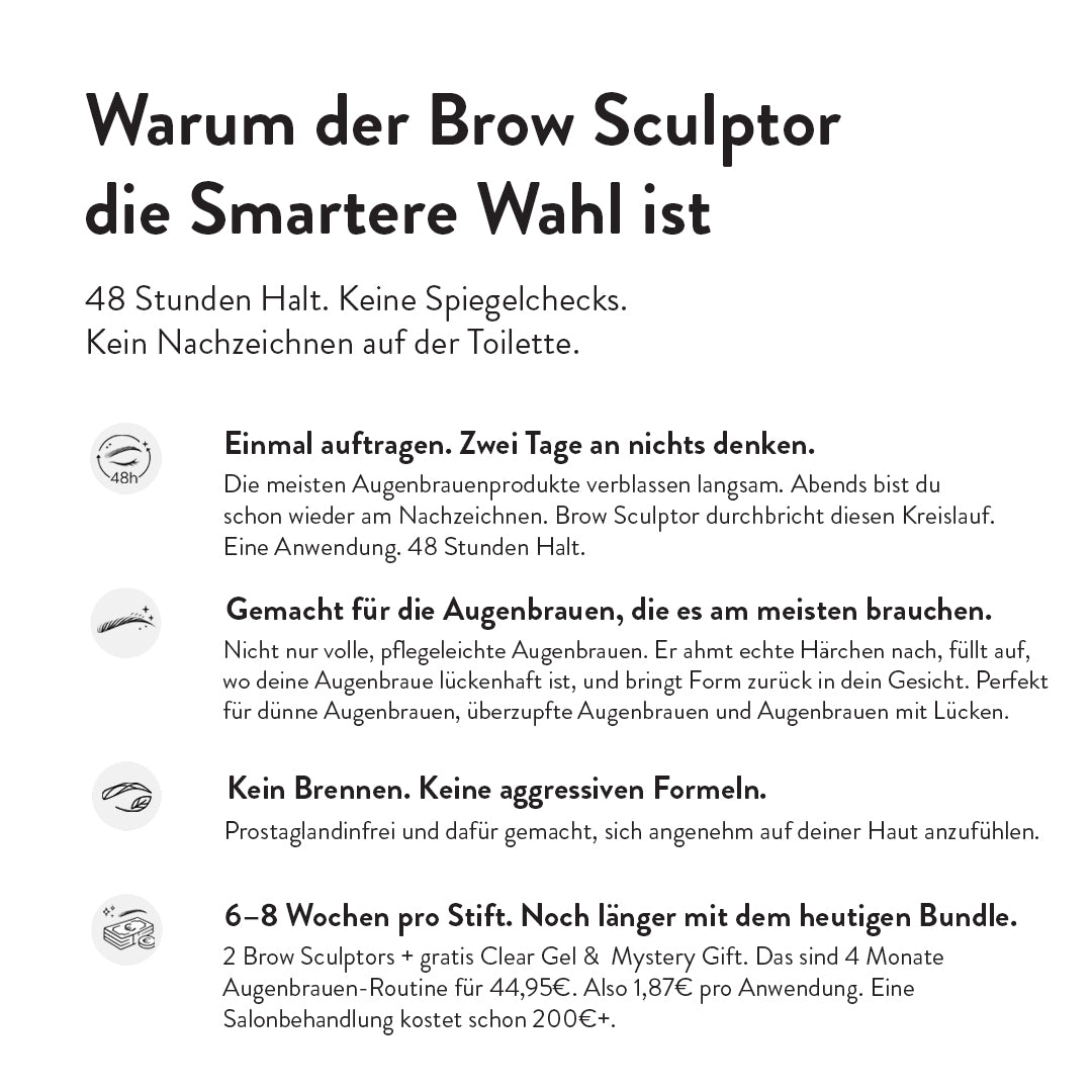 Ein Brow Sculptor hält 6–8 Wochen bei Anwendung jeden zweiten Tag. Mit zwei Stiften und einem Clear Gel Refill reicht es für 4–6 Monate. Das sind weniger als 1,87€ pro Anwendung für Augenbrauen, die 48 Stunden halten.