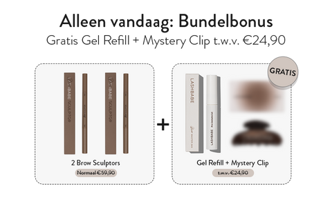 De twee pennen apart kosten €59,90. De Clear Gel Refill is €14,95 los. De Mystery Clip is €9,95. Totale waarde: €84,80. Jij betaalt €44,95. Je bespaart €39,85 — en je hebt alles in huis voor salonwaardige wenkbrauwen voor maanden.