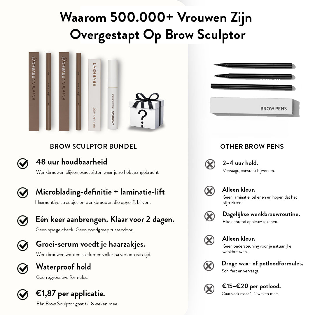 Eén Brow Sculptor gaat 6–8 weken mee bij gebruik om de dag. Met twee pennen en een Clear Gel Refill heb je genoeg voor 4–6 maanden. Dat is minder dan €1,87 per applicatie voor wenkbrauwen die 48 uur blijven zitten.